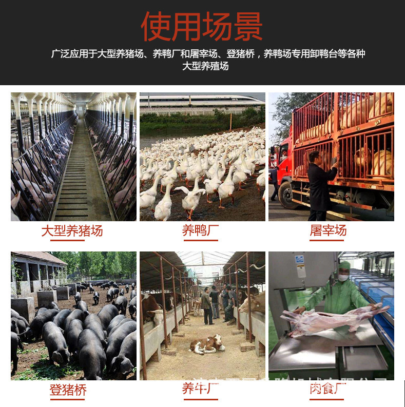 適用場合:該系列升降平臺主要用于大型養(yǎng)豬場、養(yǎng)鴨廠和屠宰場等各種大型養(yǎng)殖場