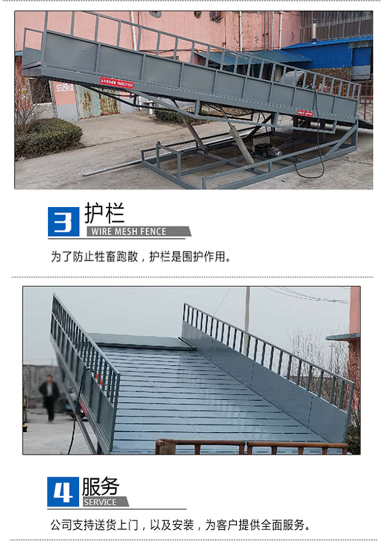 產(chǎn)品介紹:卸豬臺大型養(yǎng)豬場、養(yǎng)鴨廠和屠宰場等各種大型養(yǎng)殖場專用的液壓裝豬設備