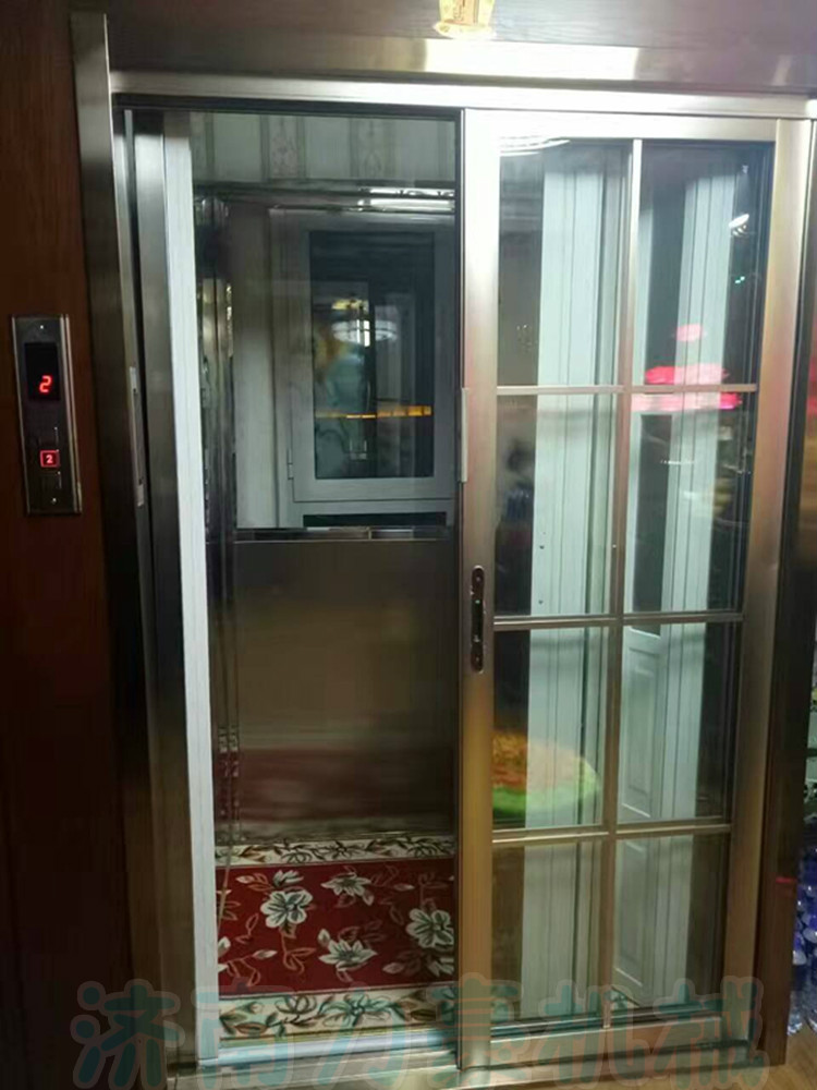 ??家用小型升降機主要用于井道空間小,載重少的場所,特別是井道小于1.5米,載重量小于500KG,采用單跨導軌鏈條式升降機外圍用不銹鋼包裝,液壓站采用進口無噪音泵站.