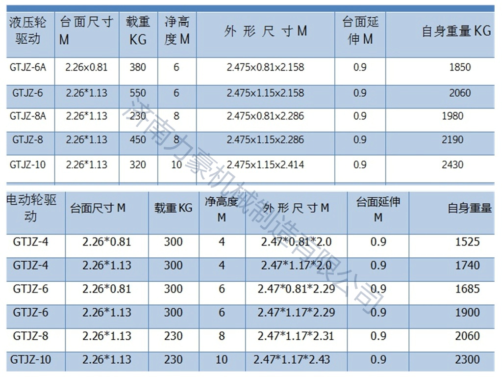 ??自行走液壓升降機主要參數:(主要根據客戶要求定做)